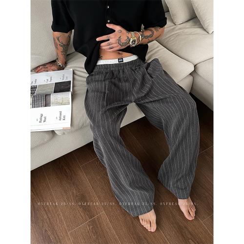(免運)OXFREAK 「雙層腰 莫蘭迪灰」撞色條紋休閑褲男直筒寬松闊腿褲子