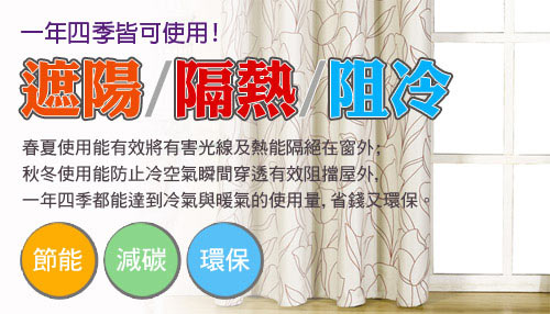 窗簾除了美觀,具有遮光效果的窗簾又多了節能減碳的美名;主要是因為使用遮光窗簾可避免陽光直接照射屋內,讓室內的溫度較室外低2~3度,如此一來冷氣就可降低高度運轉的時間,達到節約能源的功效。