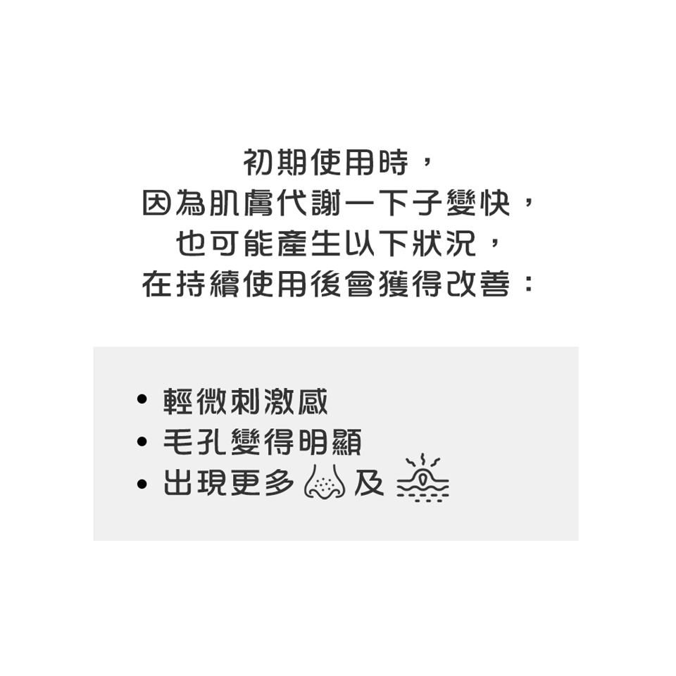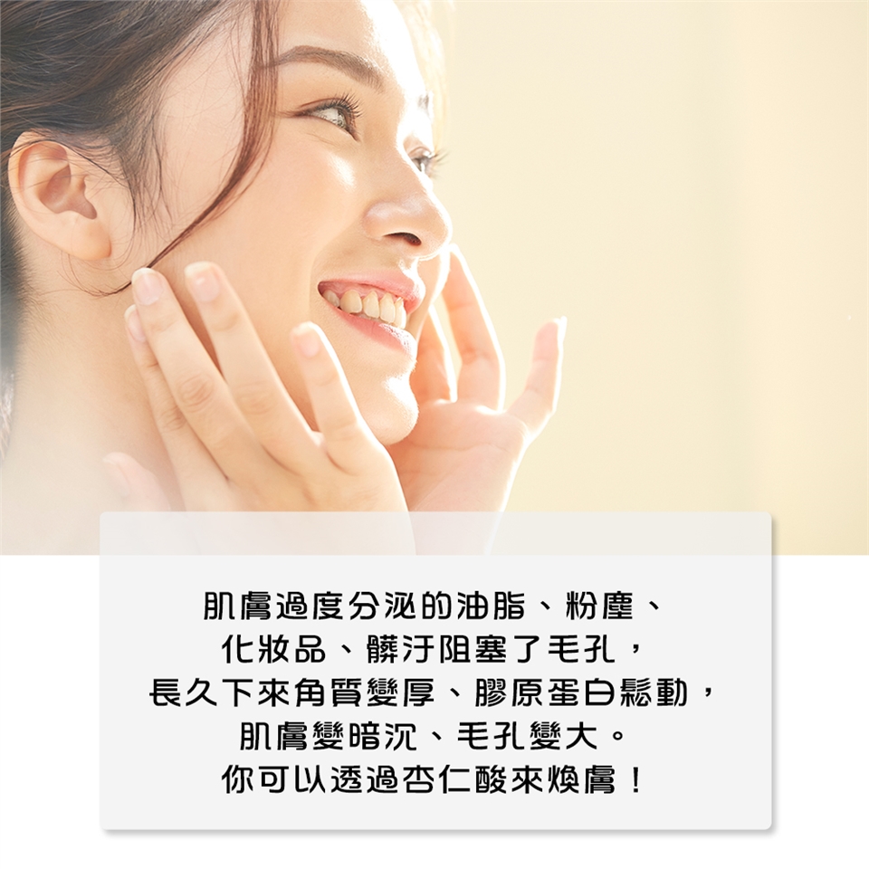 ‧卸妝清潔後→杏仁酸亮白煥膚精華→日常保養;薄薄塗抹於全臉或毛孔粗大地方(避開眼和唇周肌膚),讓杏仁酸均勻滲透至肌膚。