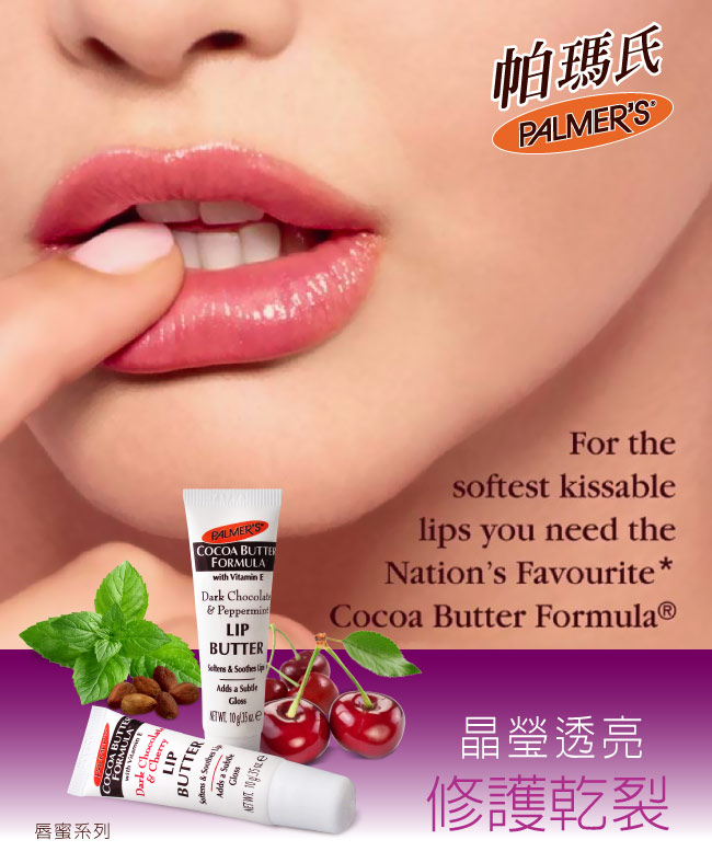 含可可脂與維他命e(tocopheryl acetatte),加強唇部保溼、柔軟雙唇、修護乾裂,