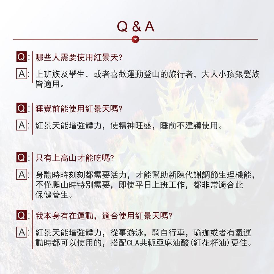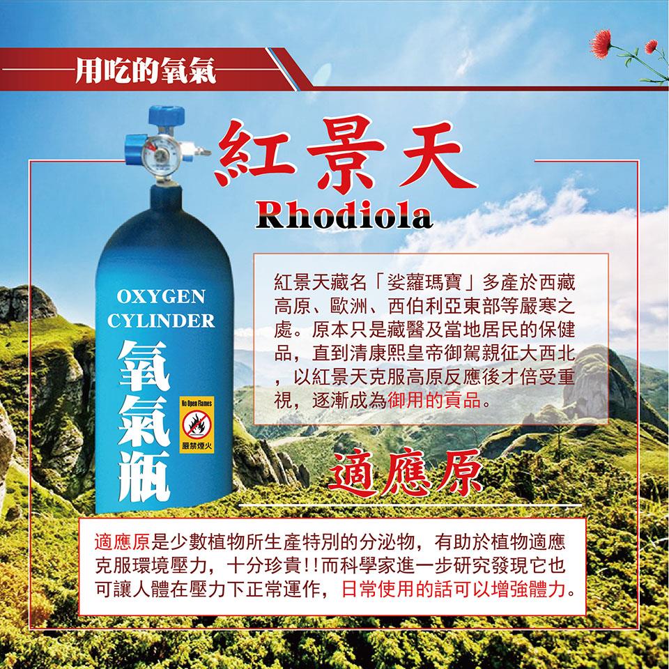 【美陸生技AWBIO】紅景天產品詳細說明:成分:藏地紅景天萃取(6%景天皂苷)250毫克,人蔘萃取50毫克,刺五加萃取50毫克,蟲草菌絲體萃取50毫克,維他命B群50毫克,維他命C50毫克,植物明膠(膠囊成分)