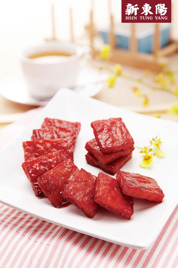 採用檢驗合格國產豬後腿肉為原料,以獨家糖燻及創新嫩化技術,特調配料醃漬按摩入味,再以專業技法烘乾成型。形狀為3~4公分磚形方塊,方便食用,再以隧道式旋風烤箱烘烤,讓每塊肉乾都能「全面炙燒」,顏色飽滿均勻,口感厚實有咬勁!