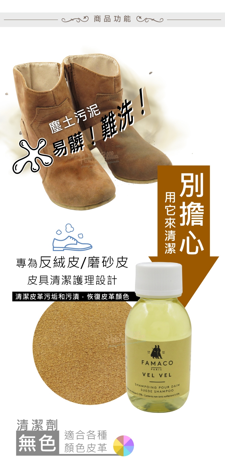 1.塵土污泥,易髒!難洗!別擔心,用FAMACO麂皮清潔劑來清潔,