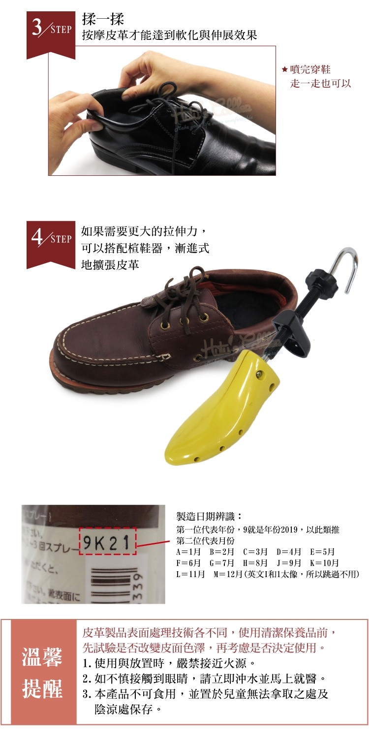 建議:如果需要更大的拉伸力,可以搭配楦鞋器,漸進式地擴張皮革