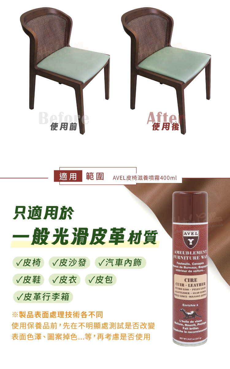 使用前先試驗是否改變皮面色澤,再考慮是否決定使用