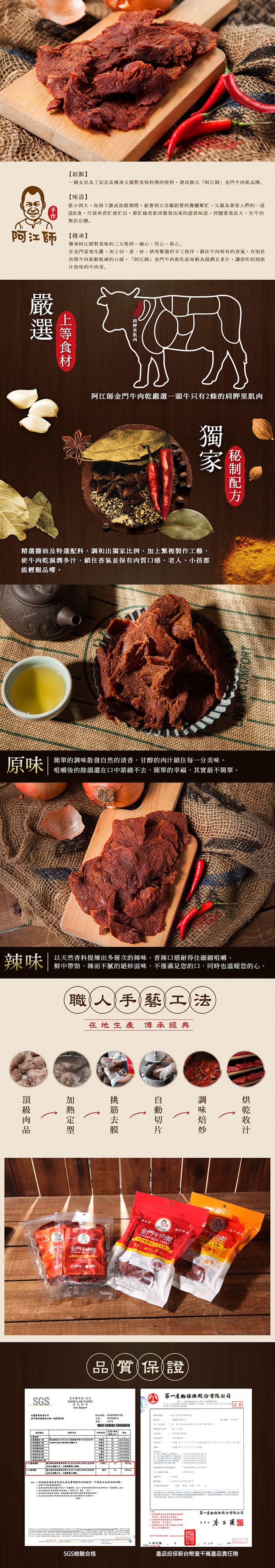 在金門當地生產,加上切、煮、炒、烘等繁複的手工程序,更能鎖住牛肉特有的香氣,有別於坊間牛肉乾較乾硬的口感,「阿江師」金門牛肉乾吃起來較為濕潤且多汁,讓您吃到原汁原味的牛肉香。