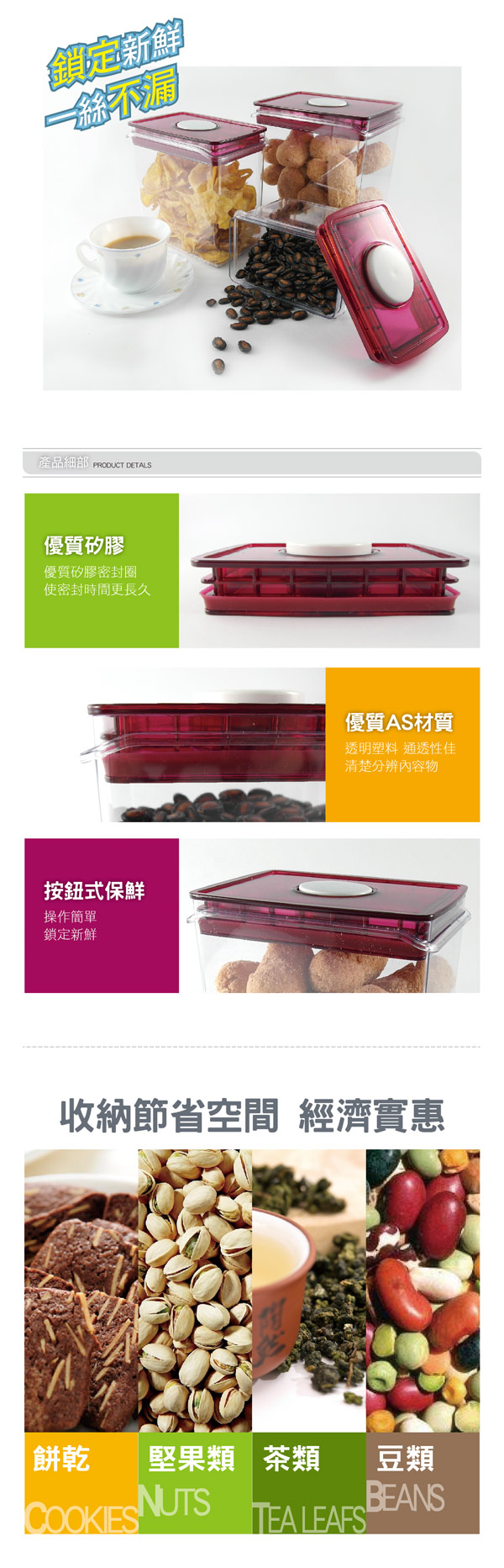 ◆蓋子設計延用特有的按壓抽取真空專利技術,有效抑制微生物繁殖,降低密封罐內含氧量,因此可延長實物保鮮期。