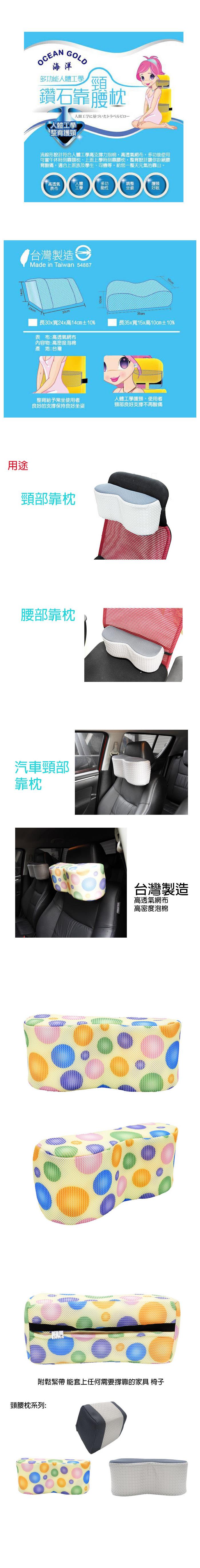 商品詳細介紹 使用方法說明 流線設計符合人體工學高支撐力泡棉,高透氣網布 午休靠頸枕 上班上學時刻靠腰枕 孕婦媽咪懷孕減輕腰痠 整背設計讓你拒絕腰背痠痛 汽車內座椅腰枕/頸枕 長途開車護腰護頸 減少疲勞 台灣製造 精品細工 注意事項 無