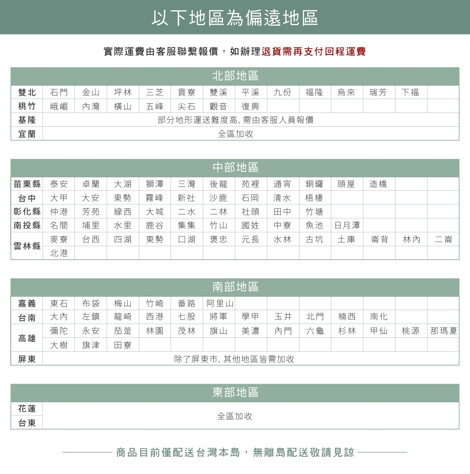 ‧以上偏遠地區,需另加購運費,請直接訂購,後續由專人為您報價(是否為偏遠地區依本公司規定)。