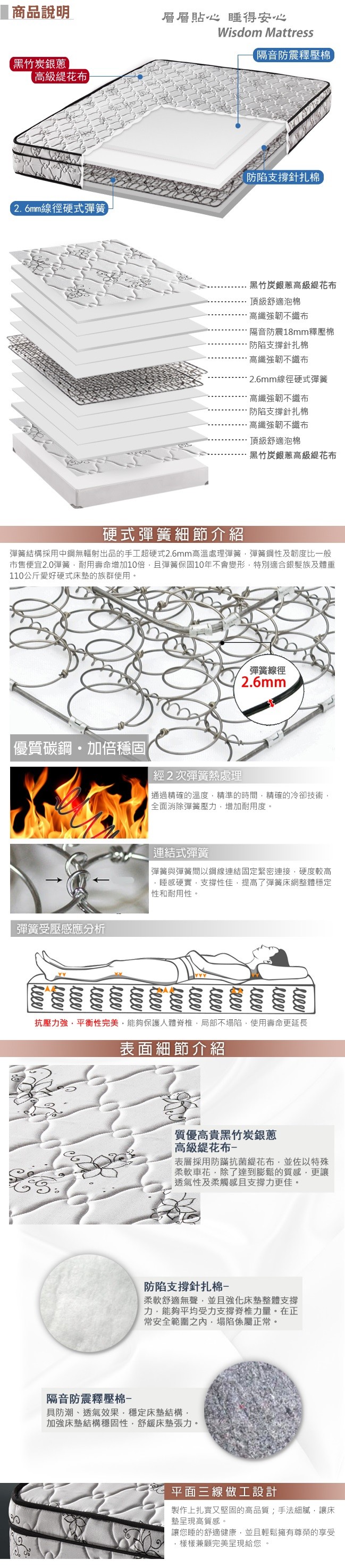 造型簡約時尚,大氣奢華高雅,線徑使用2.6mm線徑的中鋼無輻射硬式連結彈簧結構,比一般2.3硬床更堅固耐用;適合發育中的學齡兒童,避免太軟的床墊,造成脊椎側彎的傷害;而已經習慣睡硬床的老年者,就更該選擇此種床墊,因為過軟的獨立筒床墊,會造成老人家因為不習慣而產生的失眠困擾及腰酸背痛;且體重較重的愛好硬床使用者,建議使用此種床墊款式,支撐度更佳,且耐用度也提升。