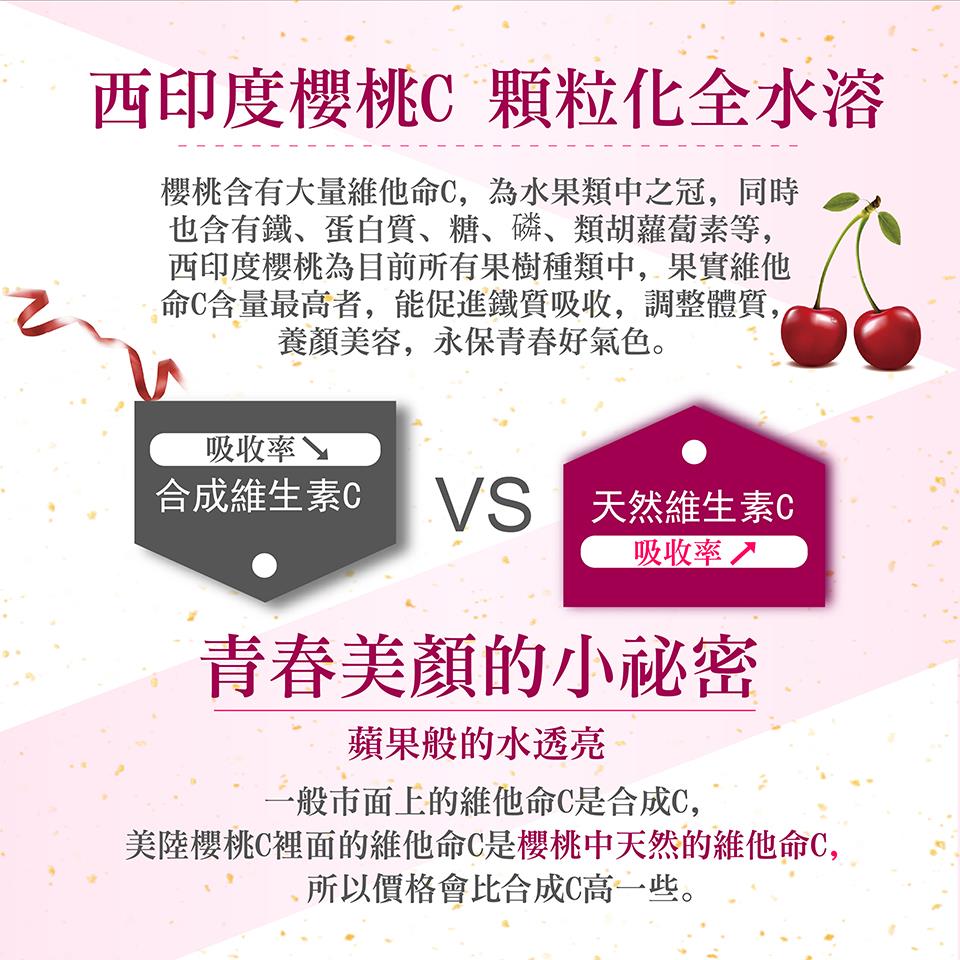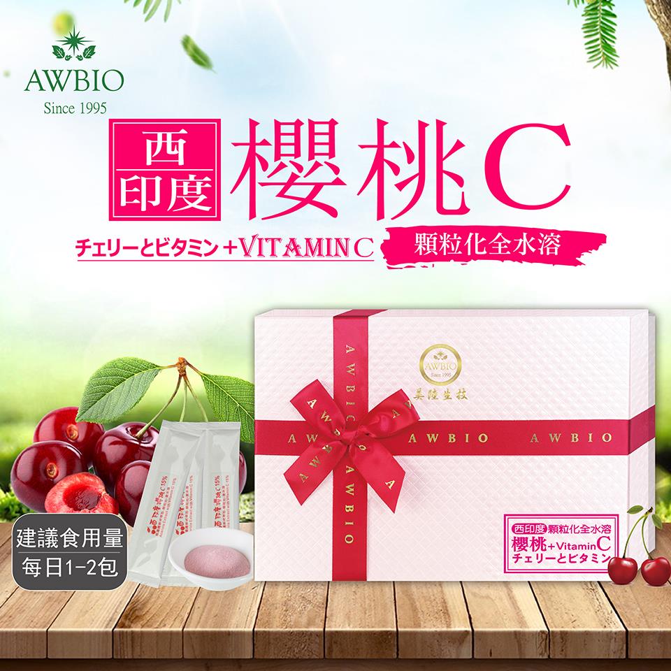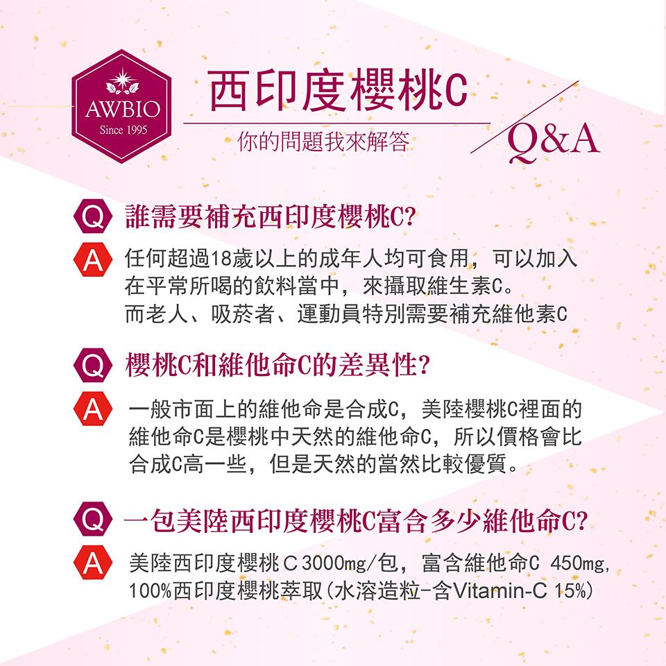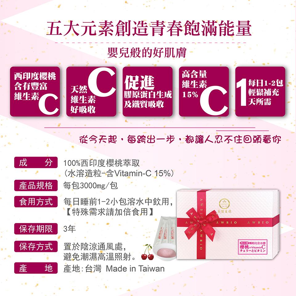 【美陸生技AWBIO】櫻桃C成分:100%西印度櫻桃萃取(水溶造粒;含Vitamin-C 15%) 食用方式:每日1至2小鋁袋,溶水食用,可搭配膠原三胜肽或GSH一起食用