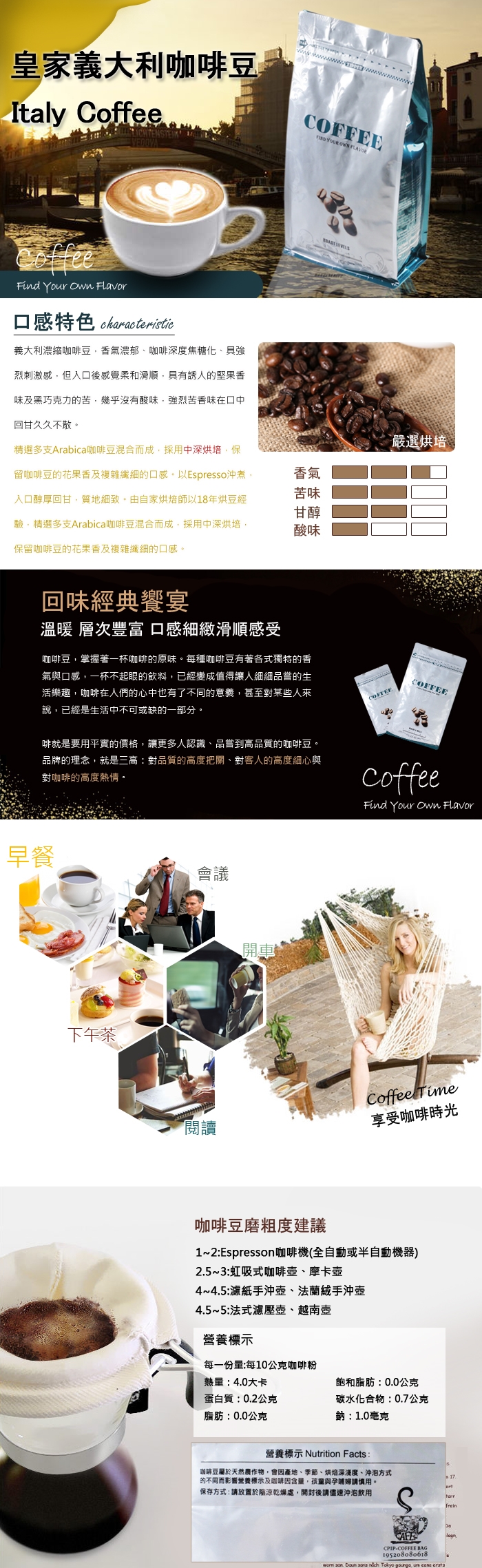義大利濃縮咖啡豆,香氣濃郁、咖啡深度焦糖化、具強烈刺激感,但入口後感覺柔和滑順,具有誘人的堅果香味及黑巧克力的苦,幾乎沒有酸味,強烈苦香味在口中回甘久久不散。