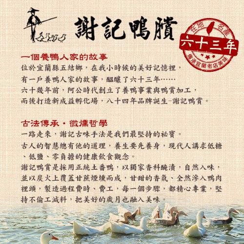 謝記鴨賞是採用正統土番鴨,以獨家香科醃漬,自然入味,並以炭火上覆蓋甘蔗煙燻而成,