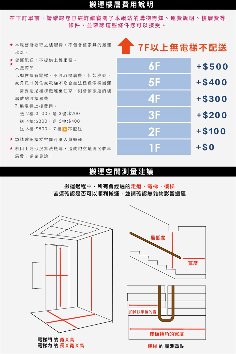 大型家具配送:電梯免收樓層費,2樓以上無電梯每層每件需加收100元。小型貨運配送:不提供上樓服務。