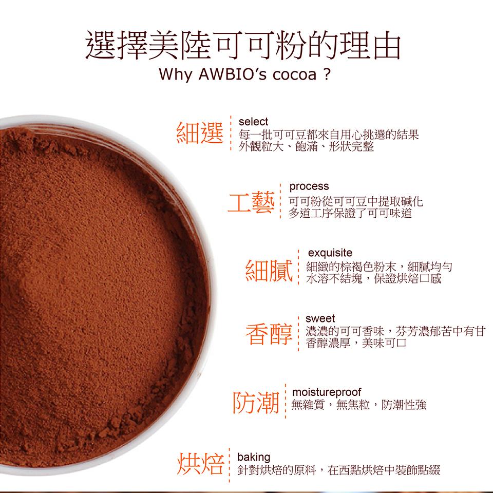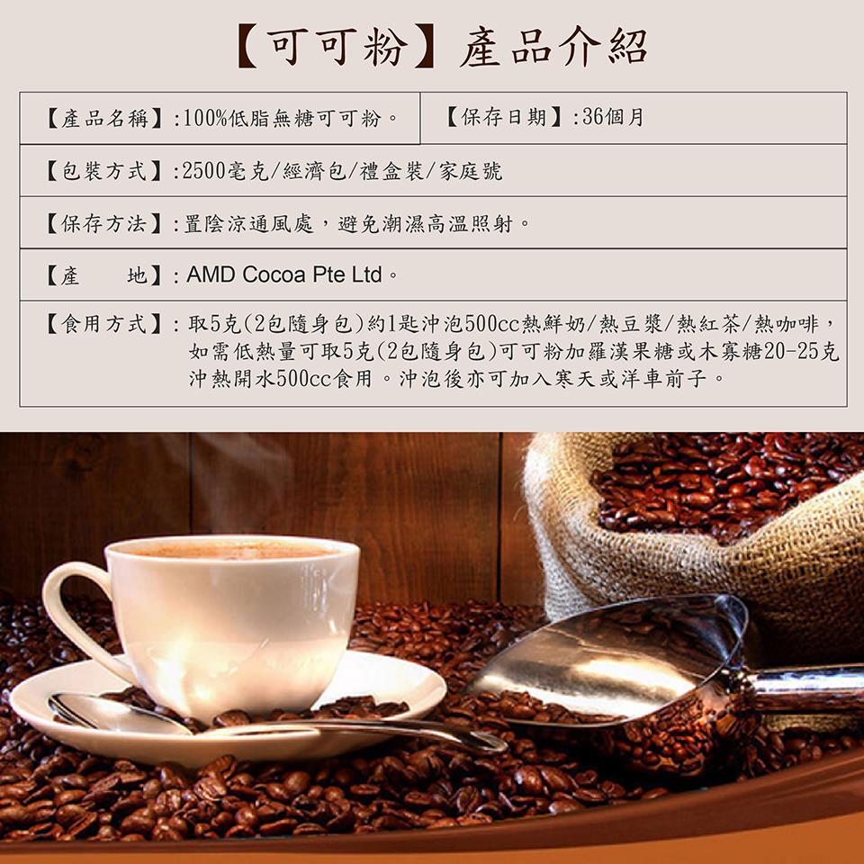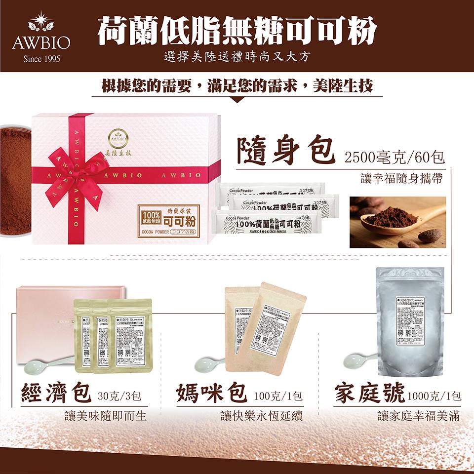 【美陸生技AWBIO】100%荷蘭低脂無糖可可粉產品介紹:名稱:100%荷蘭低脂無糖可可粉,保存期限:36個月,包裝方式:2500毫克/經濟包/禮盒裝/家庭號,保存方法 :置陰涼通風處,避免潮濕高溫照射。產地:荷蘭,食用方式:取5克(2包隨身包)約1匙沖泡 500cC熱鮮奶/熱豆漿/熱紅茶/熱咖啡,如需低熱量可取5克(2包隨身包)可可粉加羅漢果糖或木 寡糖20-25克沖熱開水500cc食用。沖泡後亦可加入寒天或洋車前子。