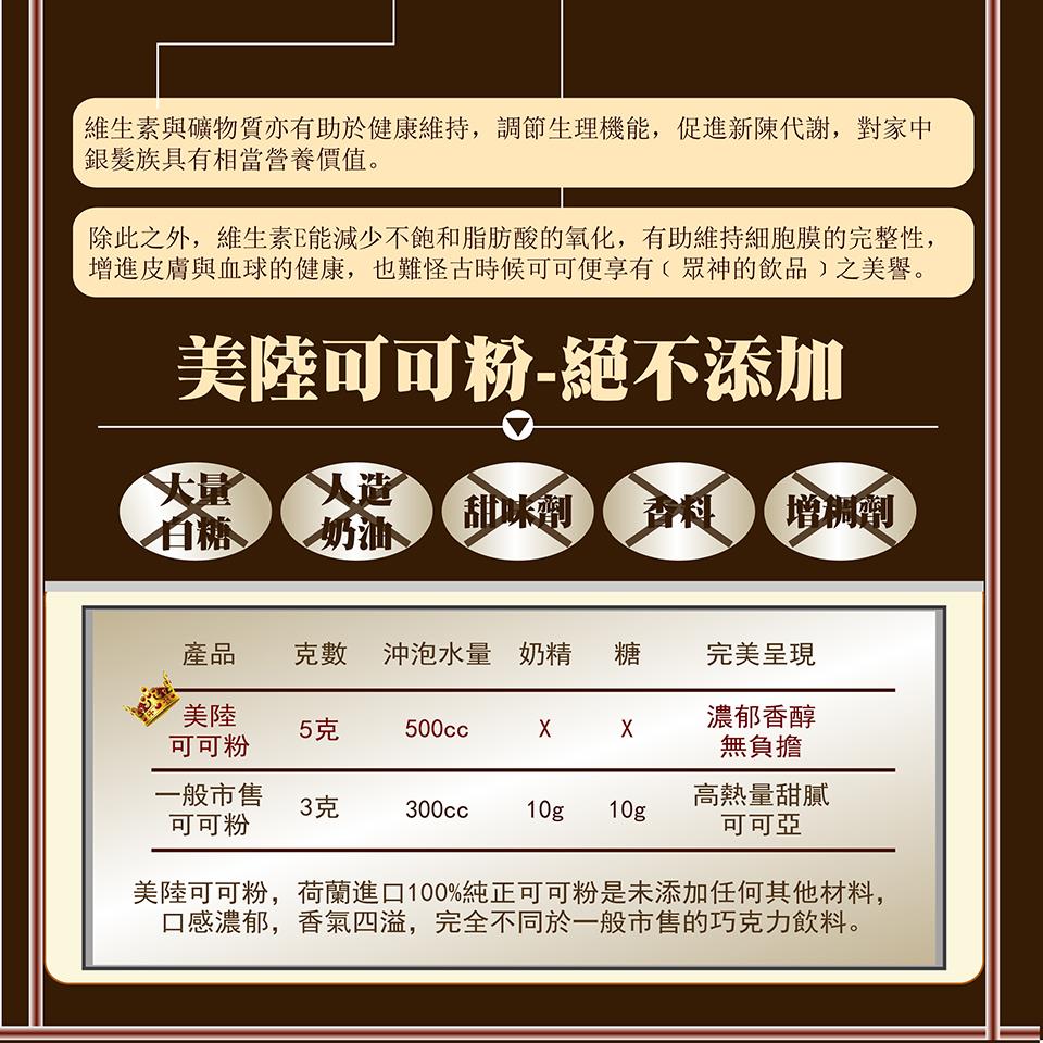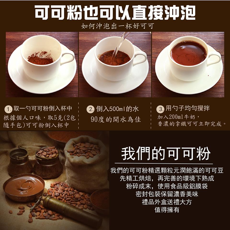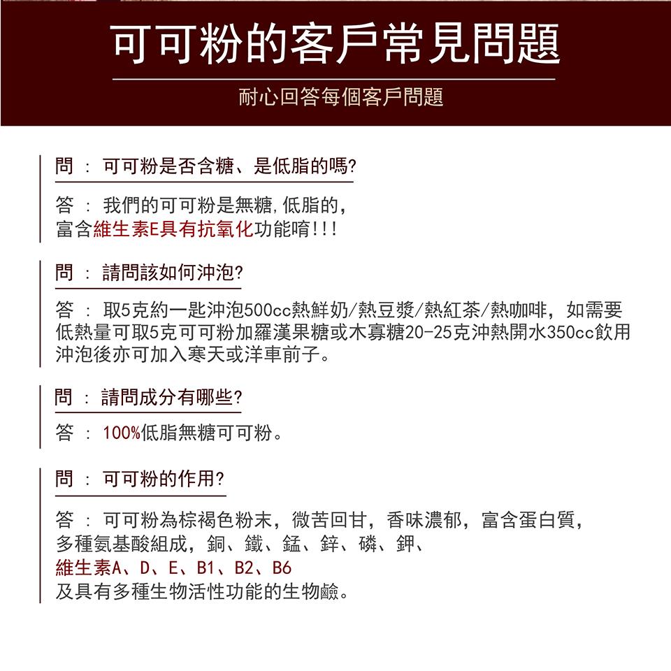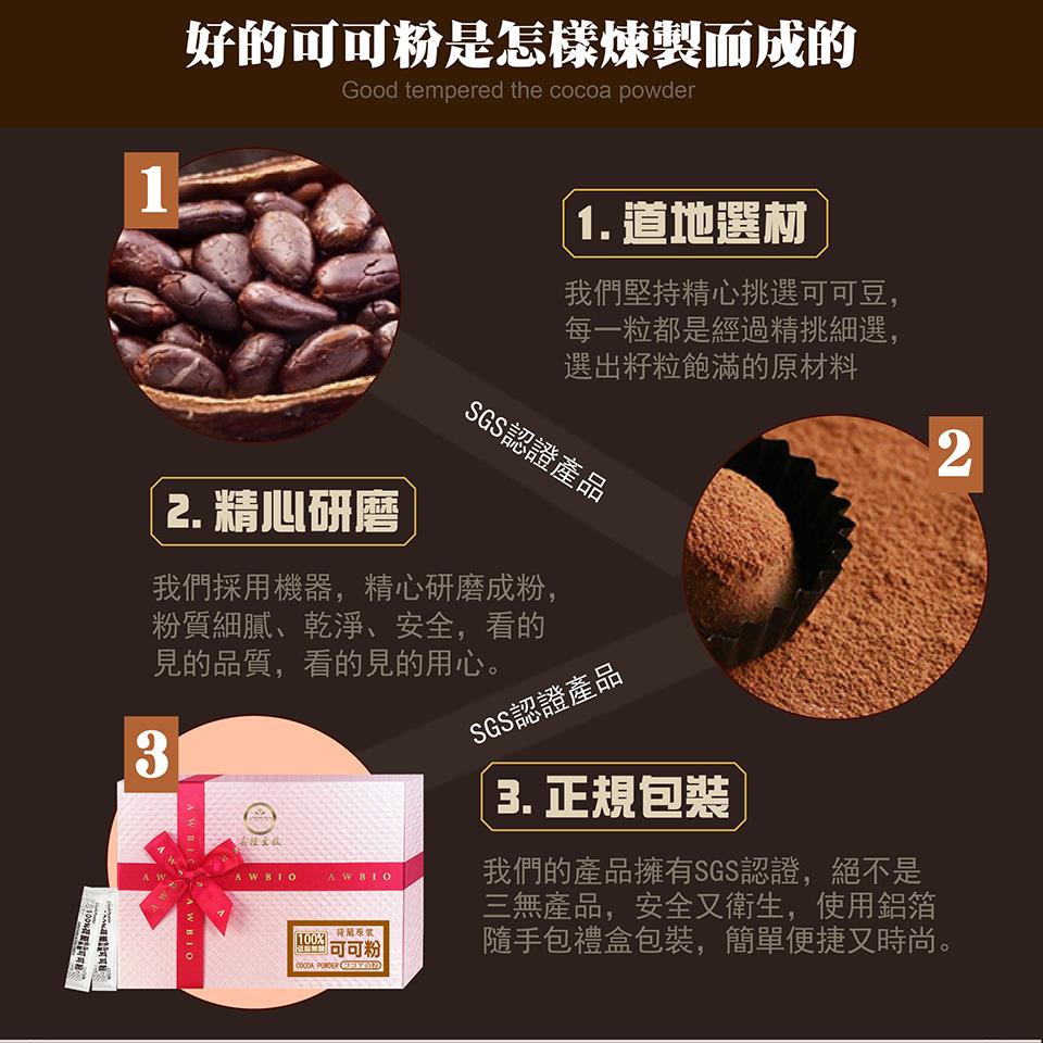 【美陸生技AWBIO】100%荷蘭低脂無糖可可粉產品介紹:名稱:100%荷蘭低脂無糖可可粉,保存期限:36個月,包裝方式:2500毫克/經濟包/禮盒裝/家庭號,保存方法 :置陰涼通風處,避免潮濕高溫照射。產地:荷蘭,食用方式:取5克(2包隨身包)約1匙沖泡 500cC熱鮮奶/熱豆漿/熱紅茶/熱咖啡,如需低熱量可取5克(2包隨身包)可可粉加羅漢果糖或木 寡糖20-25克沖熱開水500cc食用。沖泡後亦可加入寒天或洋車前子。