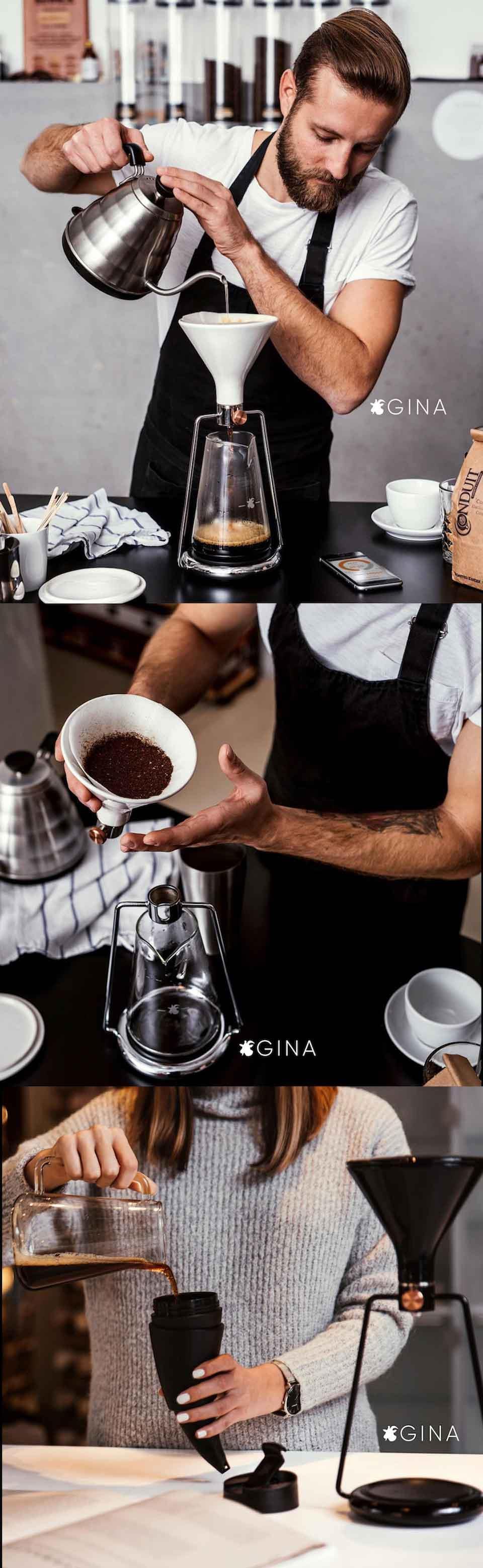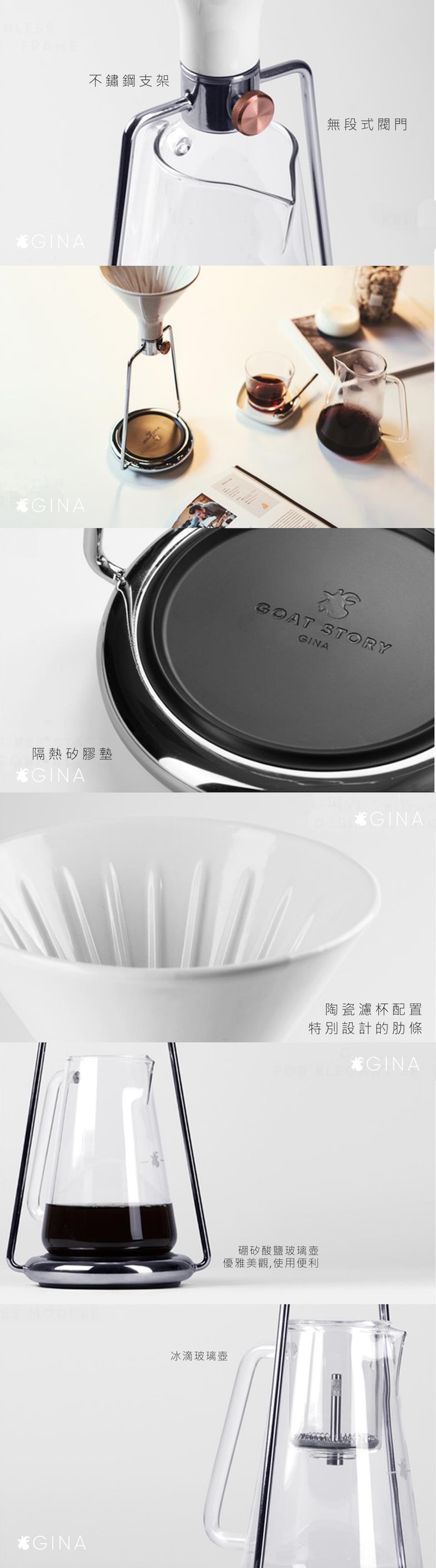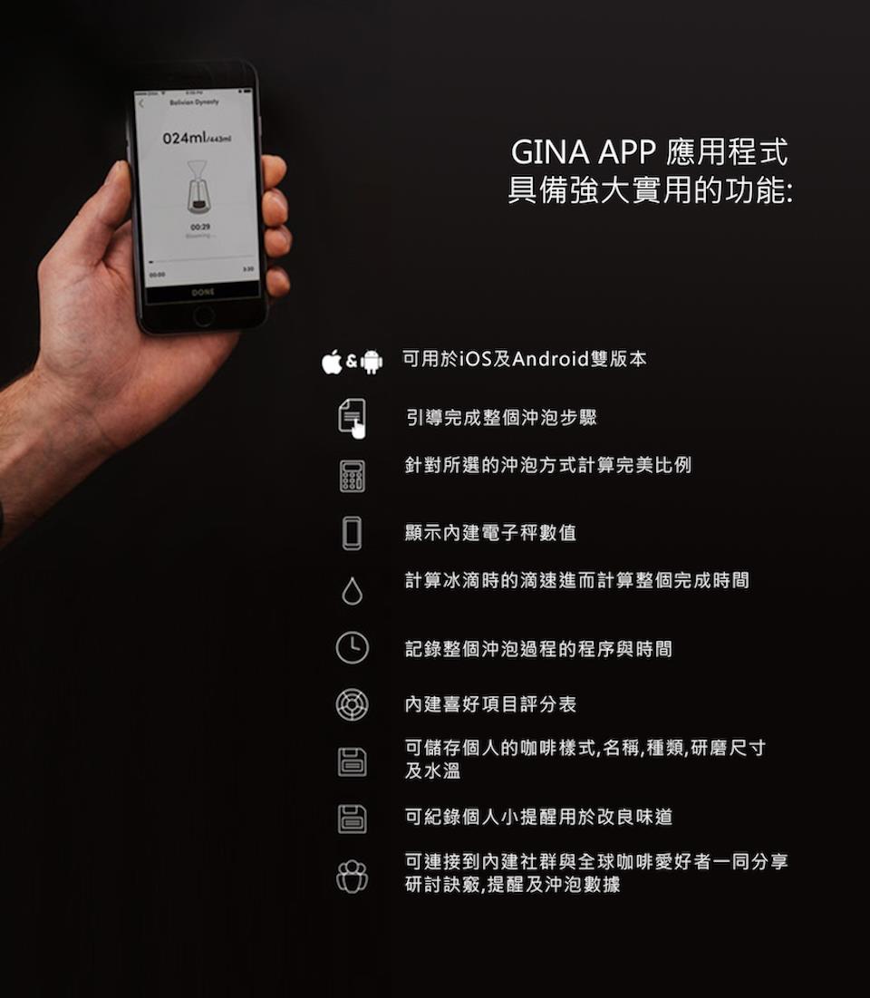 GOAT STORY團隊最新力作GINA,為手沖咖啡界注入一股智慧活力,讓咖啡壺躍進物聯網,透過官方的APP精準便利的測量及紀錄各種咖啡的組成數據,並可依照個人喜好調整數據成為使用者專屬的咖啡配置,APP內建的社群介面讓全世界的使用者分享交流不同的咖啡經驗及文化,GINA讓咖啡這個世界性飲品掀起打破封閉區域性及國境文化的智慧革命。