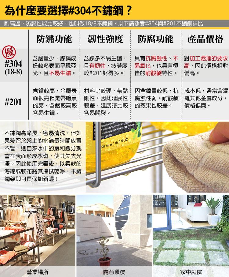 ※SUS304材質,可抗日曬無遇水生鏽問題,SUS304為同質產品最高規格材料,一般不標示材料序號的坊間產品大多是 以SUS201或較低階不鏽鋼材所生產的唷~