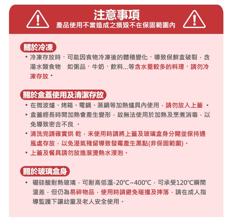 3.請勿用於明火直接加熱,以防止產品破損;堆疊收納時請加上蓋子以免產品破裂。
