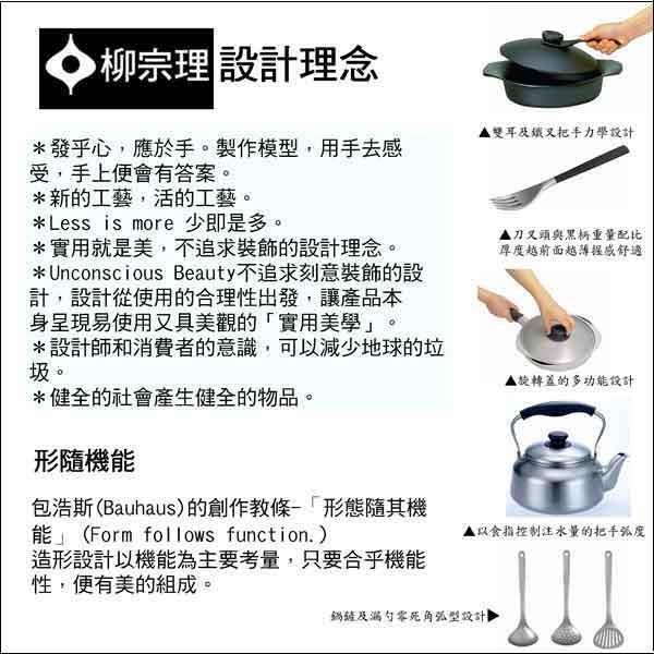 發乎心,應於手-製作模型,用手去感受,手上便會有答案,柳宗理設計不需要任何設計圖,原案是使用立體模型,而且是手工製作,做出來的模型摸摸看再使用,如此反覆再三,透過實際的使用,便可在設計時得到徹底的驗證。 柳宗理的設計風格同時顯現他的個人哲學--真正的美並非創造出來,而是自然顯現。柳宗理的器物之美,不僅只是形式與視覺上的美,而是讓你在接觸瞭解之後,可以不著痕跡地融入你的居家裡生活裡。