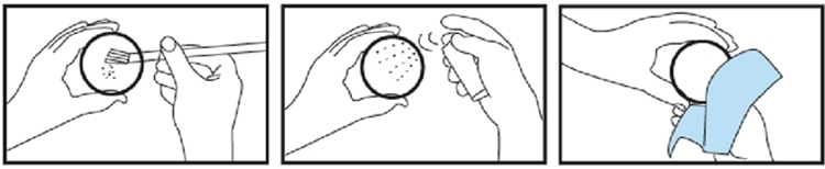 若是鏡片沾了灰塵或水滴等汙漬,請用以下方式清潔,因灰塵本身可能包含堅硬的沙粒,直接擦拭可能造成鏡片表面磨損。