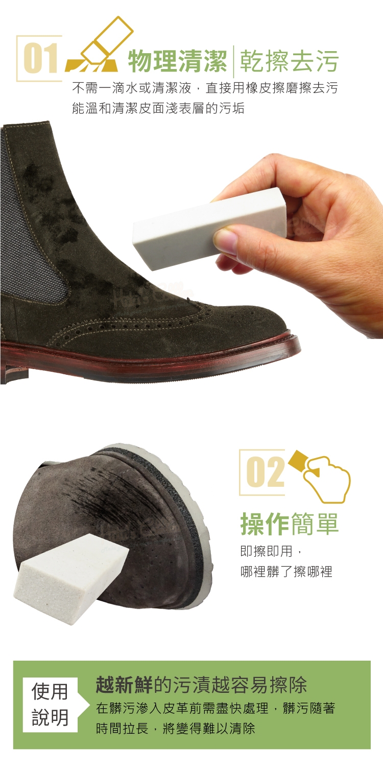 1.橡皮擦只適合表面污漬,若髒汙已深入皮革,清潔效果有限