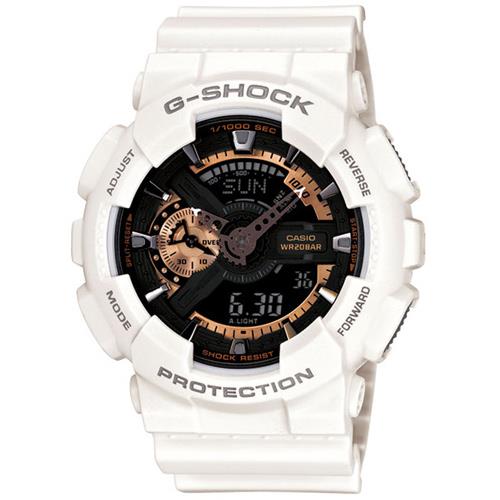 以重機裝置造型著稱的GA-110系列,於秋冬漆上成熟沉穩的古銅色澤,在錶盤嵌入金屬材質,強化其銳利機械感,有如復古重機般粗獷迷人。搭載耐震、抗磁、防水200米、1/1000秒計時碼錶、倒數計時及世界時間等機能,強悍本質不容小覷。
