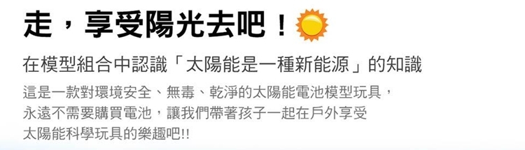 這是一款對環境安全、無毒、乾淨的太陽能電池玩具,不需要購買一般電池即可操作。本產品是太陽能玩具中基本入門款,僅47個組件,組裝容易,是陪伴孩子們度過課餘時間及寒暑假的最佳選擇。孩子們在組裝及操作過程中可實際接觸了解太陽光轉換為能源的效果並學習機械齒輪傳動的方式。