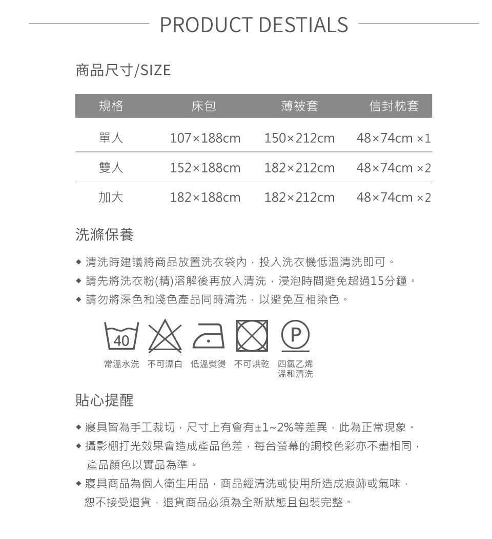 3. 洗滌方式為:先將中性洗滌劑倒入洗衣機的水中,水溫不要超過30℃ ,待洗滌劑完全溶解再放入床包組,注意浸泡時間不要超過20分鐘。