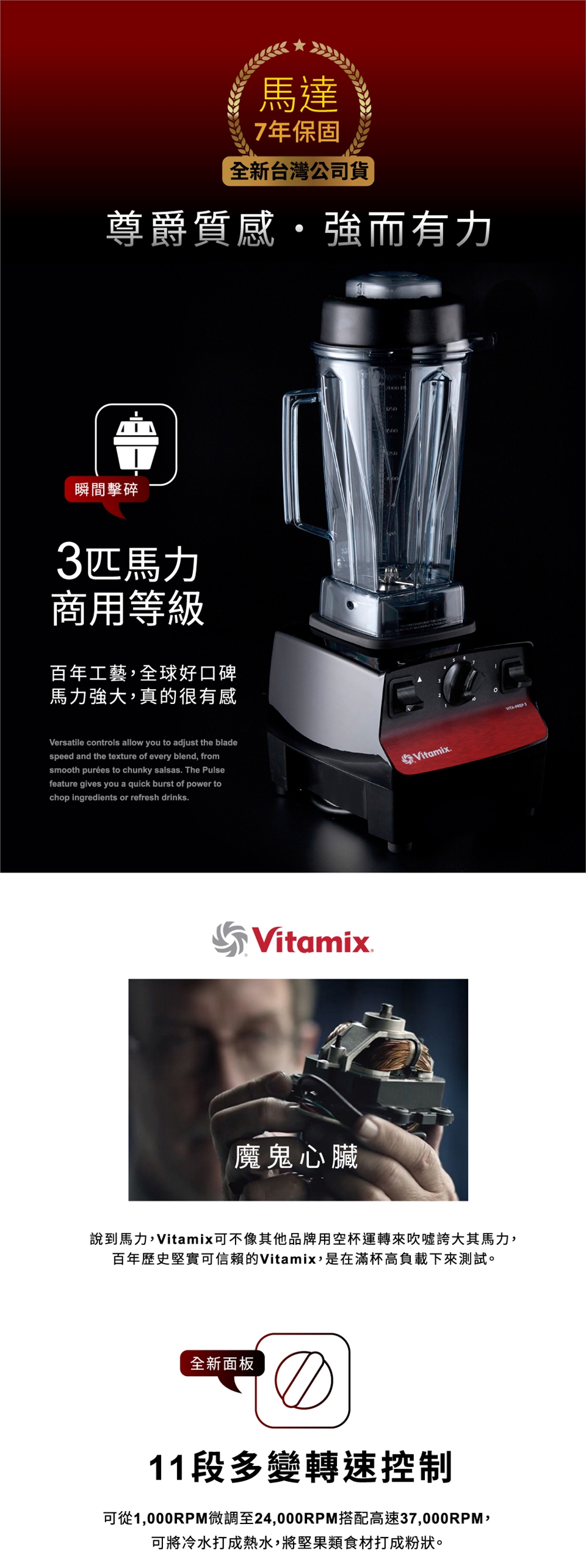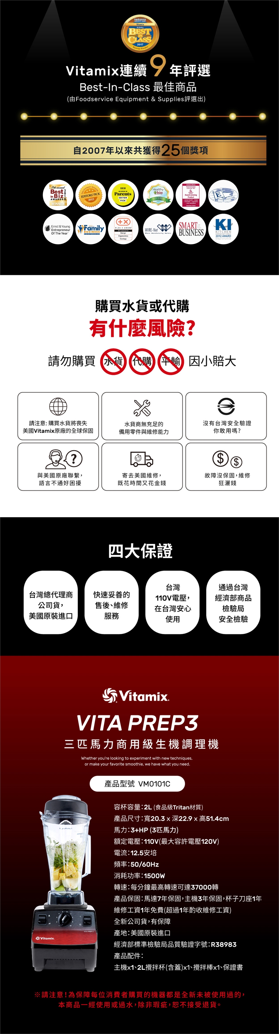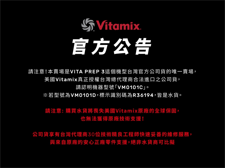●請注意!本賣場是VITA PREP 3這個機型台灣官方公司貨的唯一賣場。辨識方式可由型號來判斷:型號VM0101C為公司貨,若型號為VM0101D或標示識別碼為R36194者都是水貨。