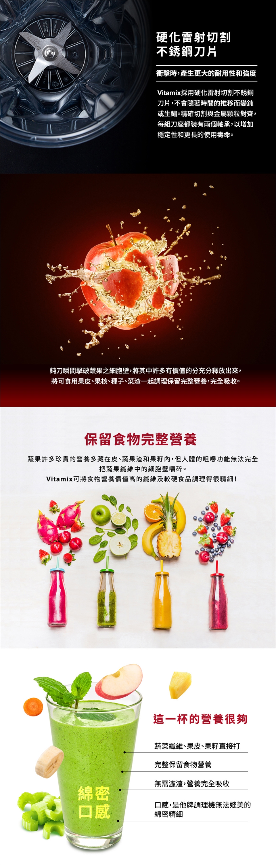 ●Vitamix不僅能保留食物的營養和膳食纖維,並且把粗糙的皮、籽都打得綿密細緻,將其中許多有價值的營養充分釋放出來,讓人體容易消化吸收。