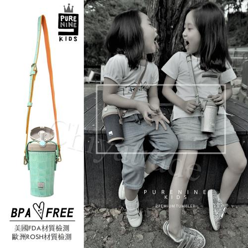 【韓國PURENINE】兒童頂級時尚彈蓋隨身多功能保溫杯-290ML(附皮杯套+背帶)-湖綠色皮套+灰蓋瓶組