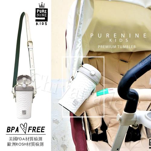 【韓國PURENINE】兒童頂級時尚彈蓋隨身多功能保溫杯-290ML(附皮杯套+背帶)-白色皮套+灰蓋瓶組