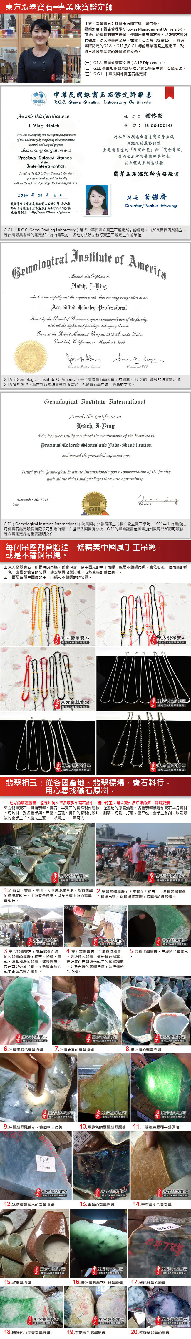 2.每個玉石(翡翠、寶石、半寶石、有機寶石...等等),都會有屬於自己的特殊紋路,石脈紋,礦石晶體紋理,冰裂紋,雲霧,色帶的深淺變化,各種原礦共生的結構,以及玉石天然的紋理和礦缺。對於東方翡翠寶石的購買,如果是線上購買,東方一定會再次拍照讓您看過,確認無誤才會出貨。