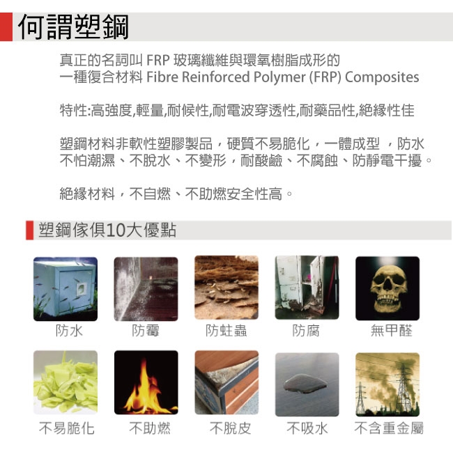 防水+防燃+無甲醛安心塑鋼材質,結構牢固耐用,也不用擔心蟲蛀的煩惱,使用放心