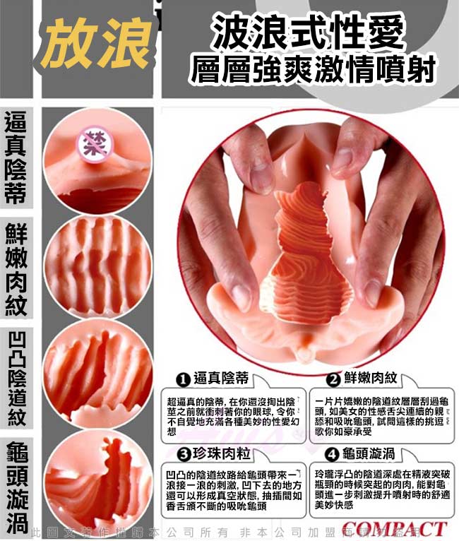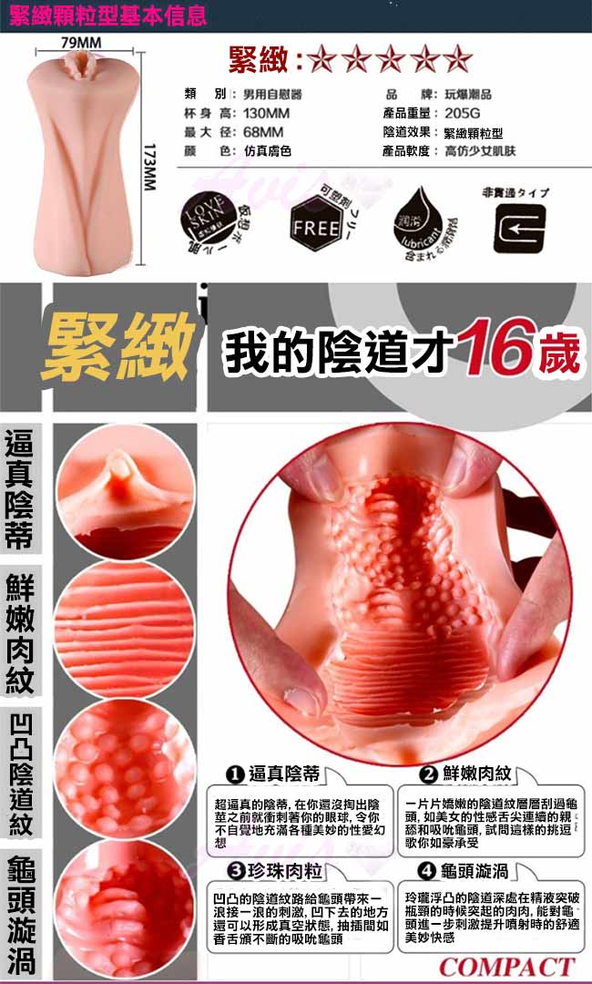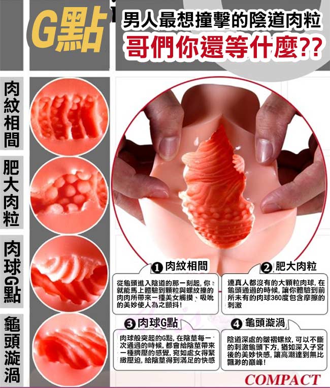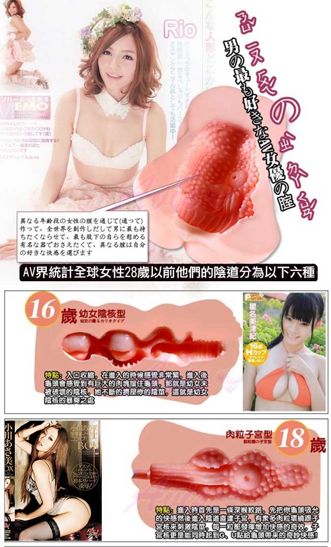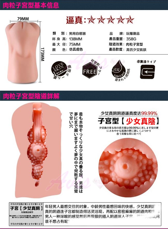 進入時首先是一條深喉紋路,先把你的龜頭吸允然後進入陰道直達子宮,有眾多肉粒環繞根子宮核來刺激陰莖,每一粒都發揮增加快感的奇效 子宮核更是能同時給龜頭帶來奇妙快感