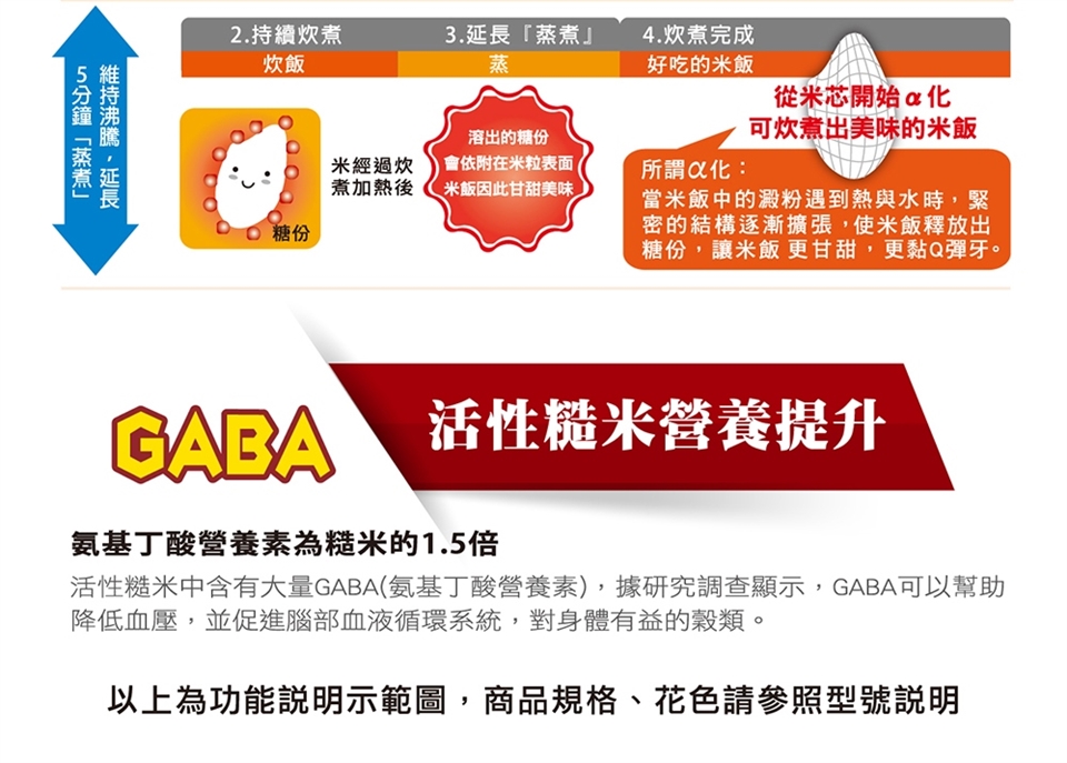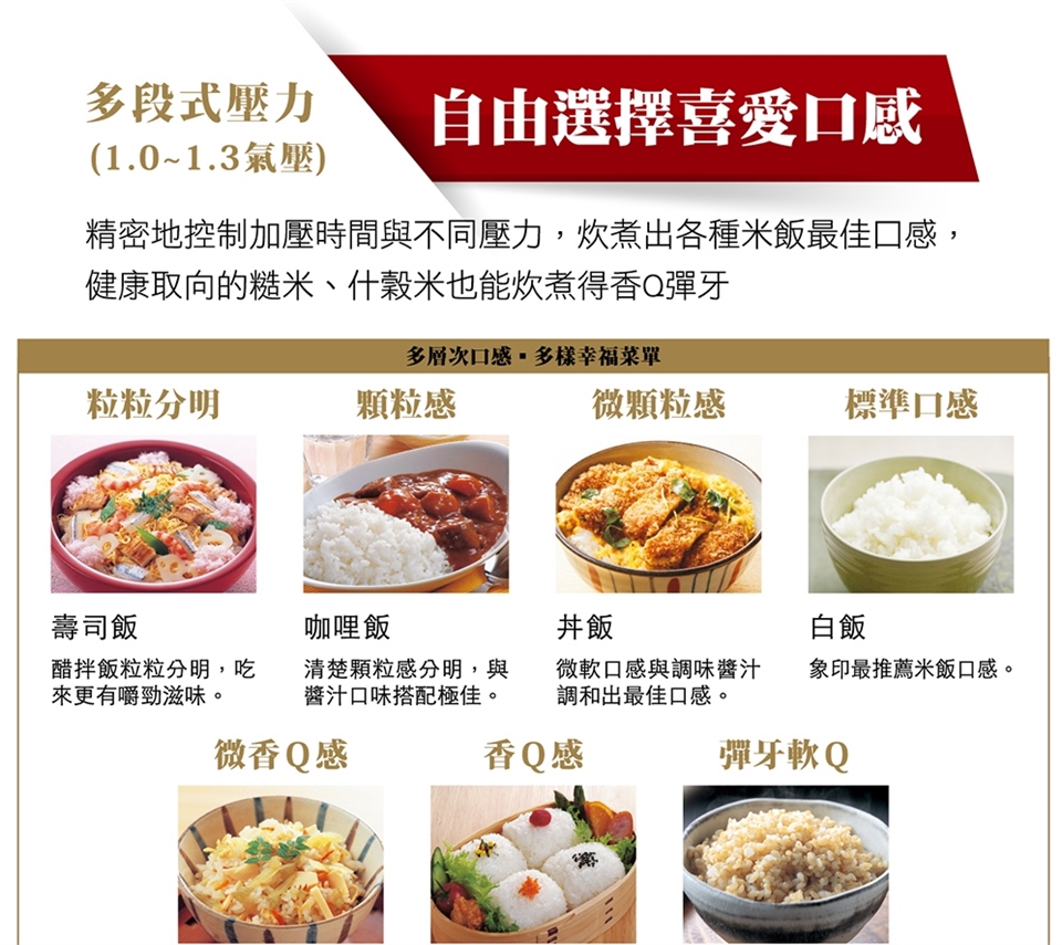 (5)「多段式壓力(1.0-1.3氣壓)」炊煮出不同口感。