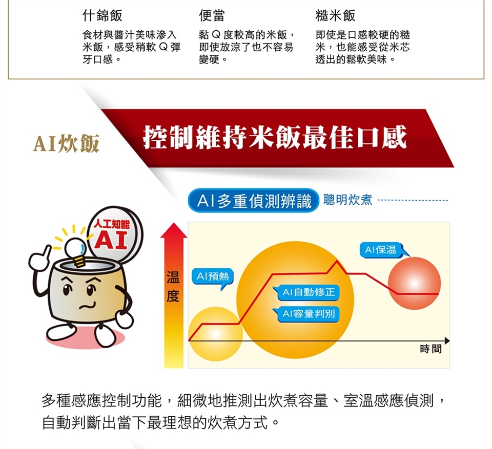(11)「節能炊飯」.「AI炊飯」.「保温監控」.「極致美味」.「蒸氣減量」。