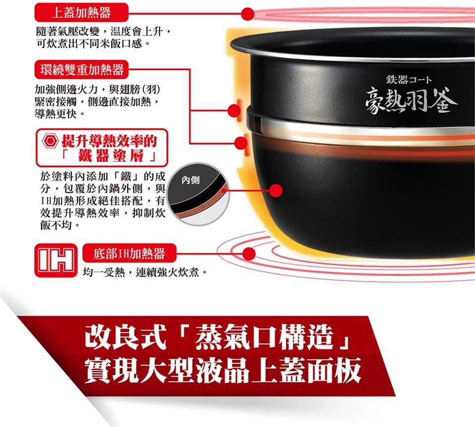 (1)提升導熱效率「鐵器塗層豪熱羽釜」(厚釜2.2mm)。