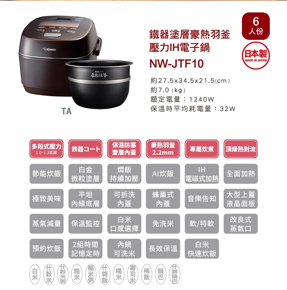 象印*6人份*鐵器塗層豪熱羽釜壓力IH電子鍋(NW-JTF10)