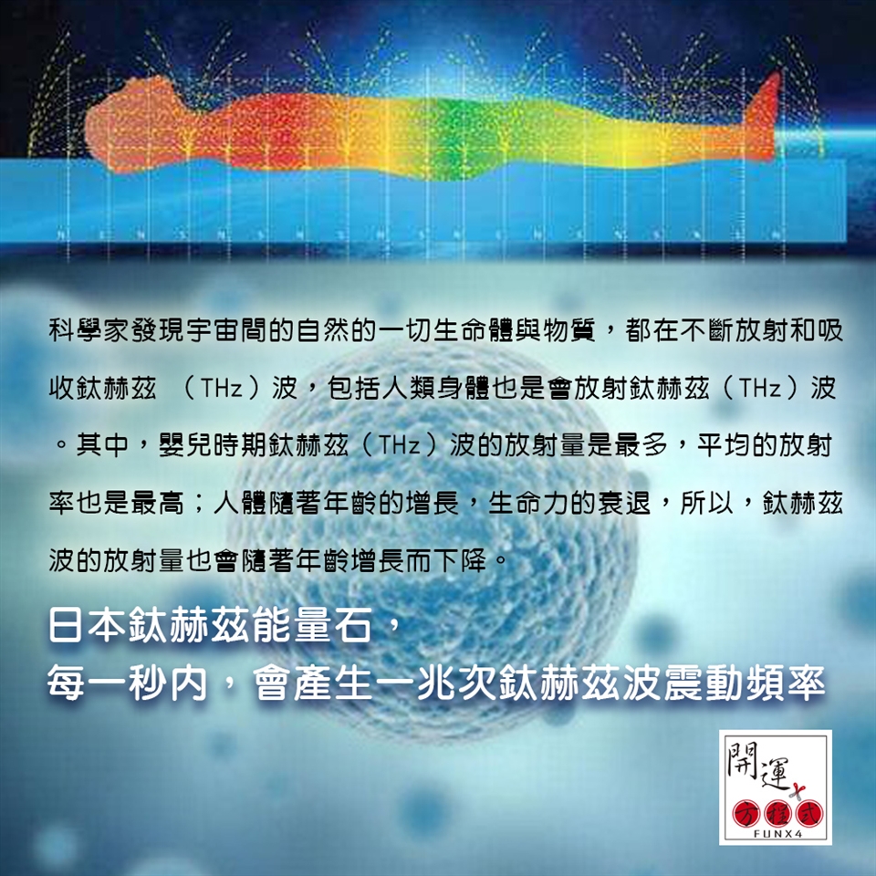 3.科學家發現宇宙間的自然的一切生命體與物質,都在不斷放射和吸收鈦赫茲 (THz)波,包括人類身體也是會放射鈦赫茲(THz)波。其中,嬰兒時期鈦赫茲(THz)波的放射量是最多,平均的放射率也是最高;人體隨著年齡的增長,生命力的衰退,所以,鈦赫茲波的放射量也會隨著年齡增長而下降。