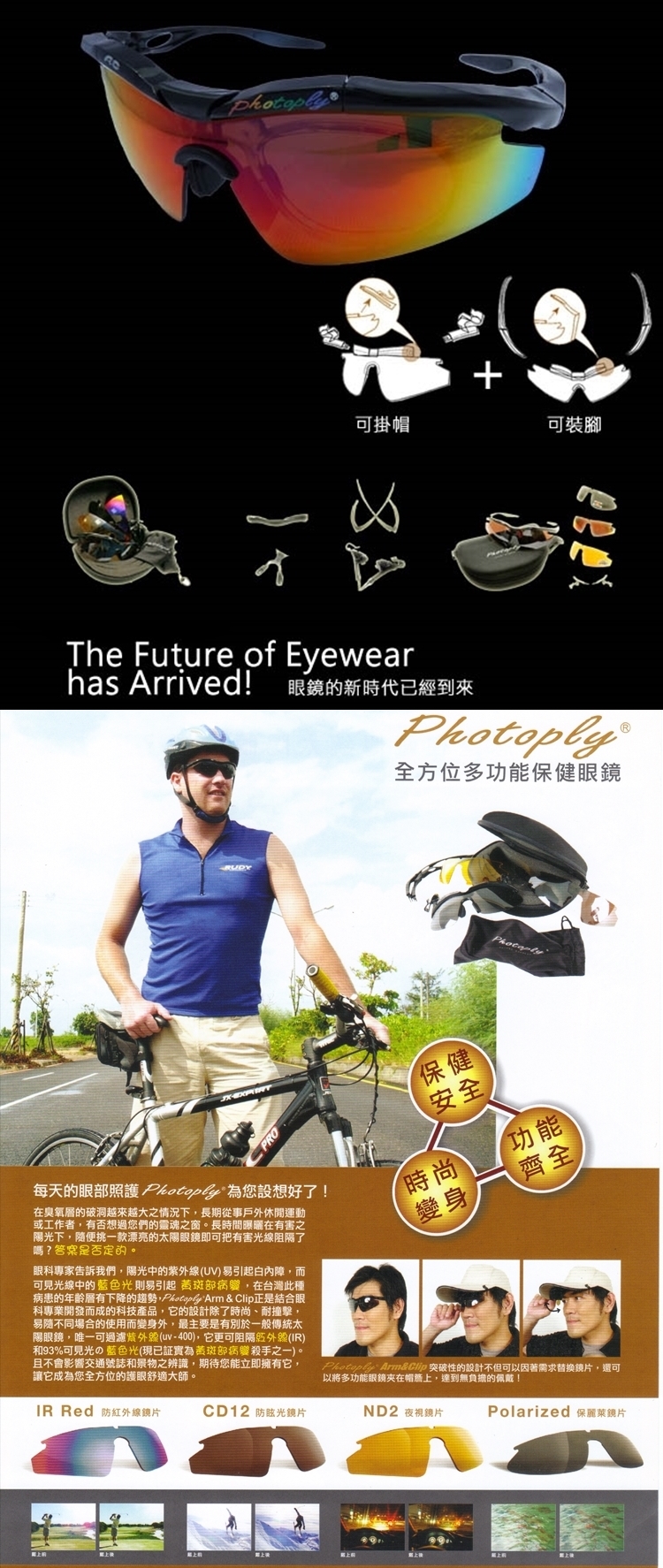 ●【品名】PHOTOPLY多功能一代全方位太陽眼鏡組(可耳掛&帽載;含4個太陽鏡片:IR抗紅外線&CD12抗藍光&POL偏光&ND2夜視)