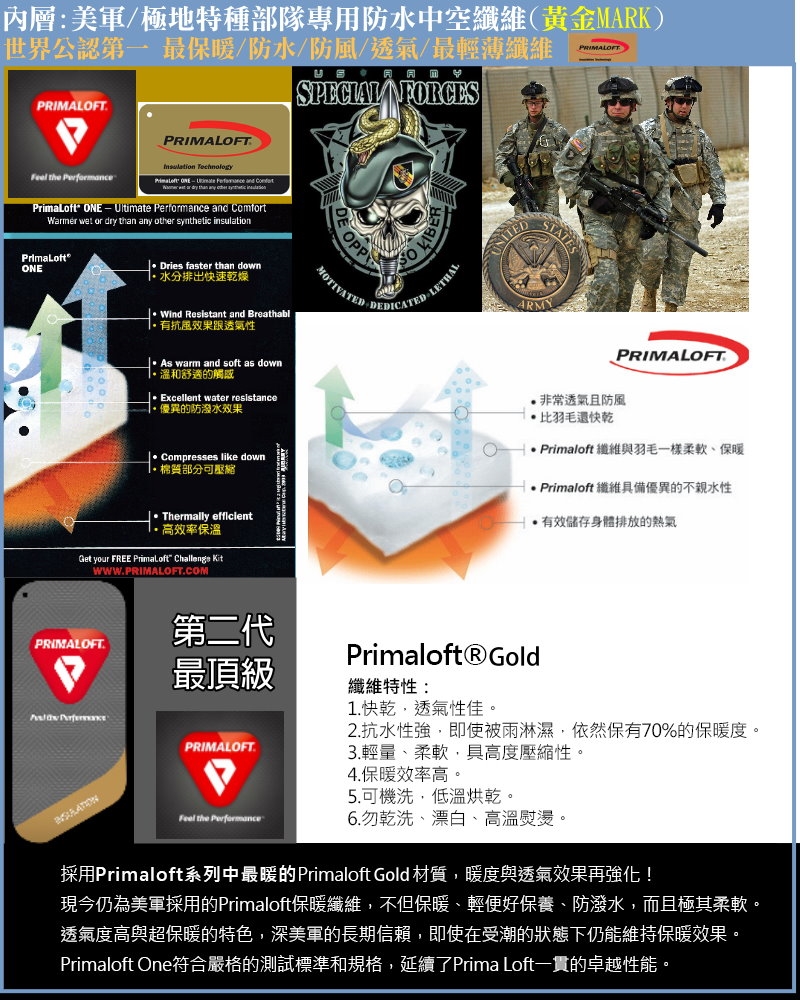 軍用PRIMALOFT頂級防水透氣多孔中空超保暖纖維(黃金特級標)
