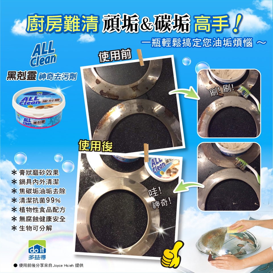 來自英國純植物配方,具有特殊膏狀磨砂顆粒,超強的清潔力對於燒焦、油垢、碳垢的鍋具或廚具都能輕鬆不費力的清潔 產品用途: 瓦斯爐具、排 油煙機、 流理台、微波爐、烤箱、熱水器、烤肉用具、浴缸、洗臉台、等去污 注意事項:內含膏狀磨砂顆粒 ,請勿用於不沾鍋或有塗層怕傷的鍋具上 |