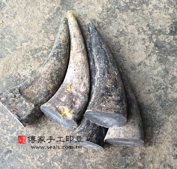 另外, 每一支牛角皆是經過嚴格的篩選。一支牛角原料只能裁切出幾支牛角章,裁切好後才知內部好與壞,若印身呈現錐狀,須捨去淘汰不用,因此留下來的皆是上等的牛角印材。