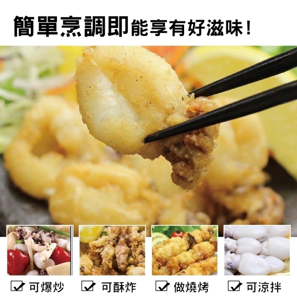 一口小花枝,新鮮急速冷凍鎖住最新鮮的風味!口感超Q彈牙,一口大小剛剛好!簡單好料理,川燙或做成冷盤都適合!營養豐富適合全家人一同享用