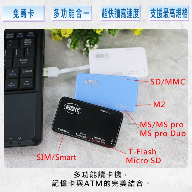 ● 支援SIM/SMART/SD/SDHC/SDXC/MMC/MS DUO/MS PRODUOMS/MS PRO/MicroSD/TF/M2