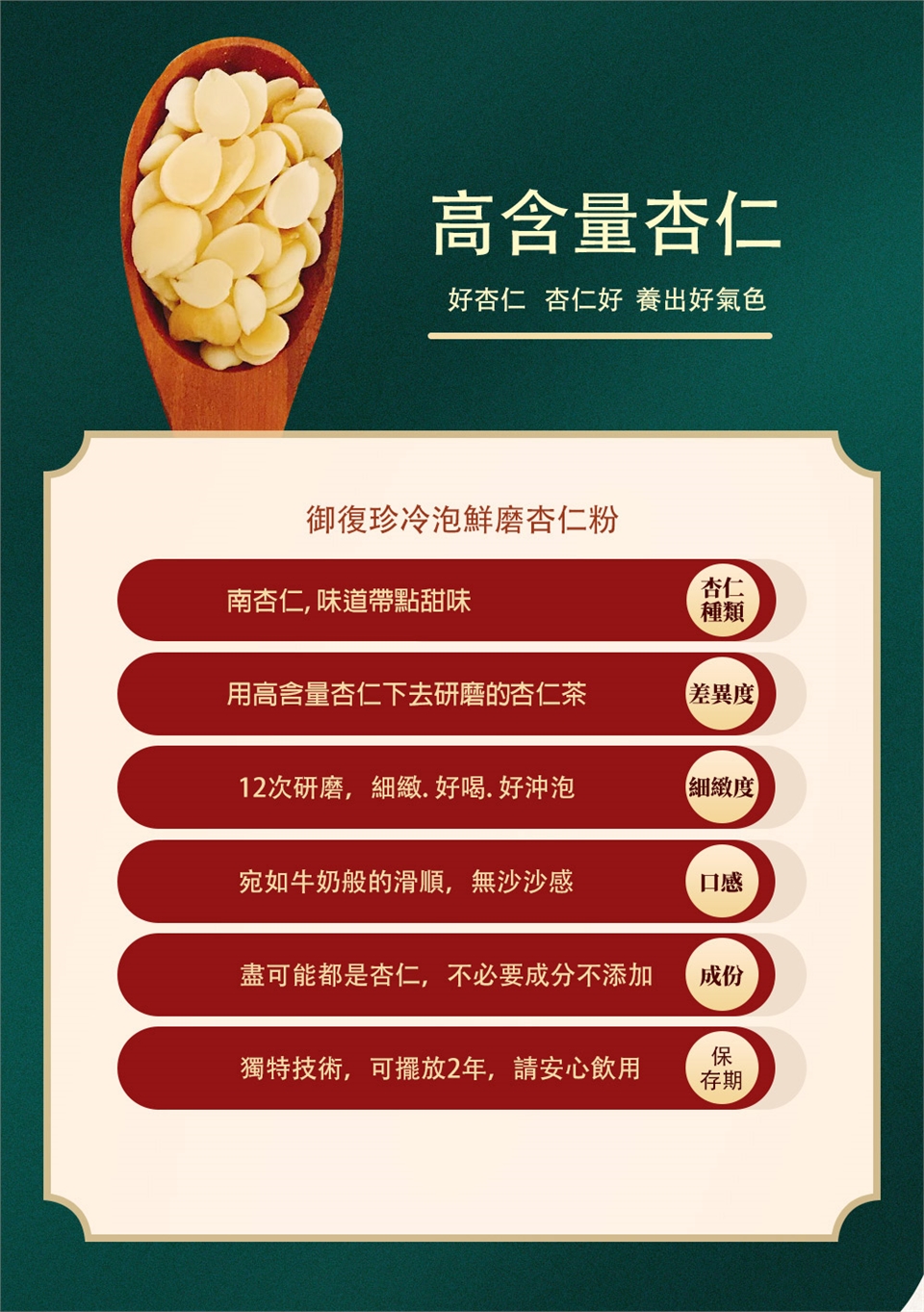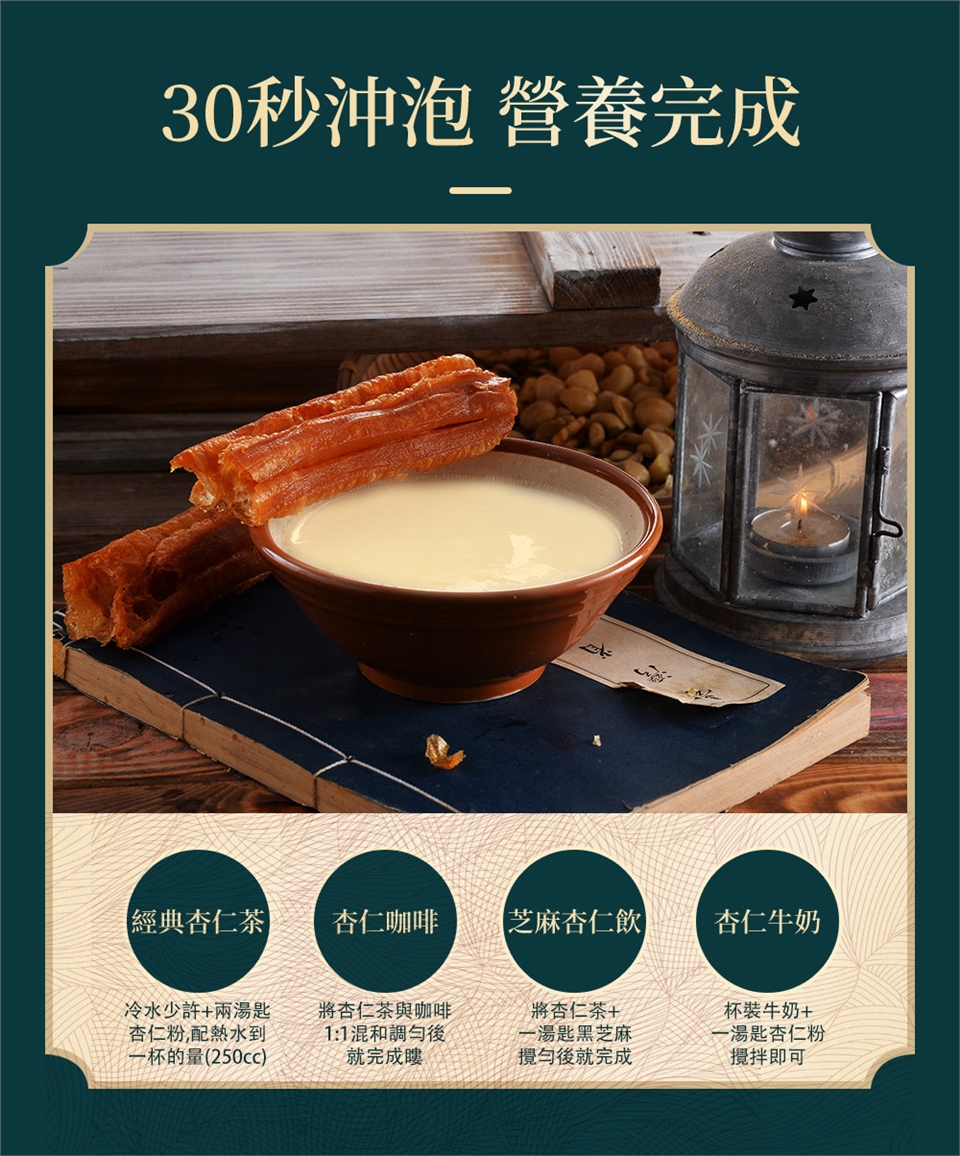 商品詳細介紹 體驗說明 不可體驗 使用方法說明 取2-3茶匙搭配300cc的冷熱水調勻,亦可適量加入牛奶或豆漿,即是一杯營養又美味的養生飲品 注意事項 本品牌為自有工廠生產,同時有生產腰果、小麥、黃豆、芝麻等成分,如會過敏,請特別留意