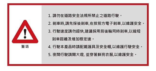 2. 剎車時,請先採後剎車,在按前方電子剎車,以維護安全。