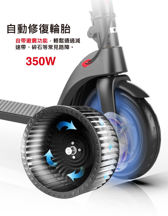 * 9吋充氣防滑大輪胎, 騎乘舒適